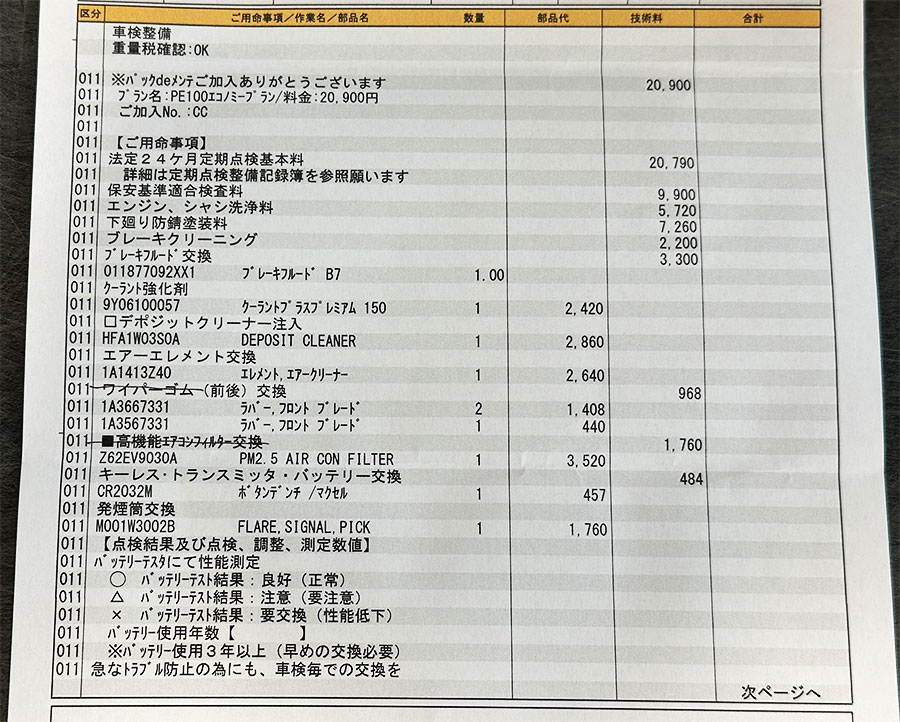 見積りで定番のメニューが出てきましたが、ワイパーゴムとエアコンフィルターは交換したばかりなので抜いてもらう。
