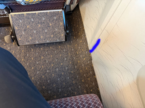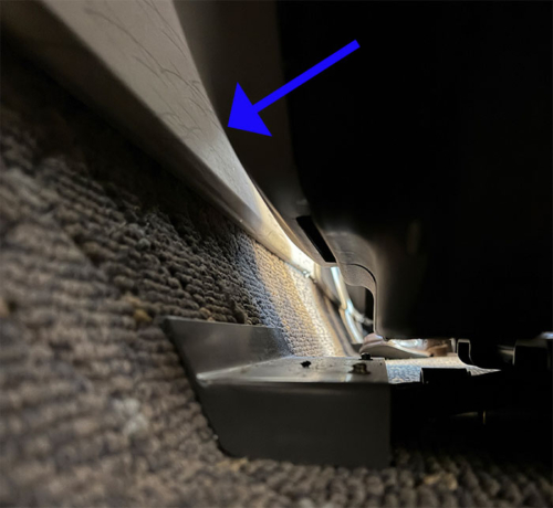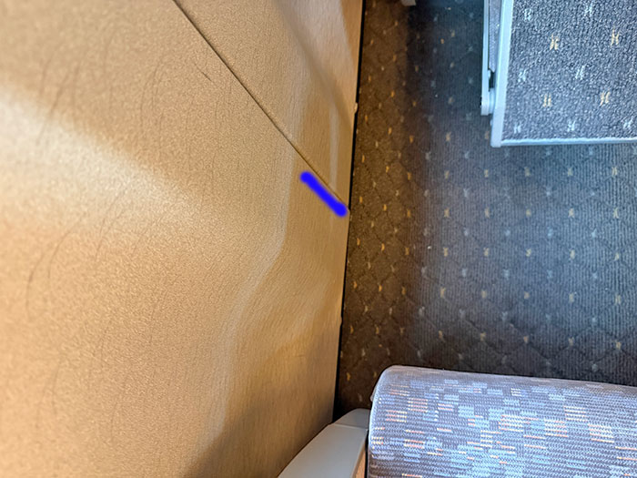 窓枠のプラスチックのパネルの下の方、カーペットとの境目の部分(青線の部分)が内側に曲がっている。