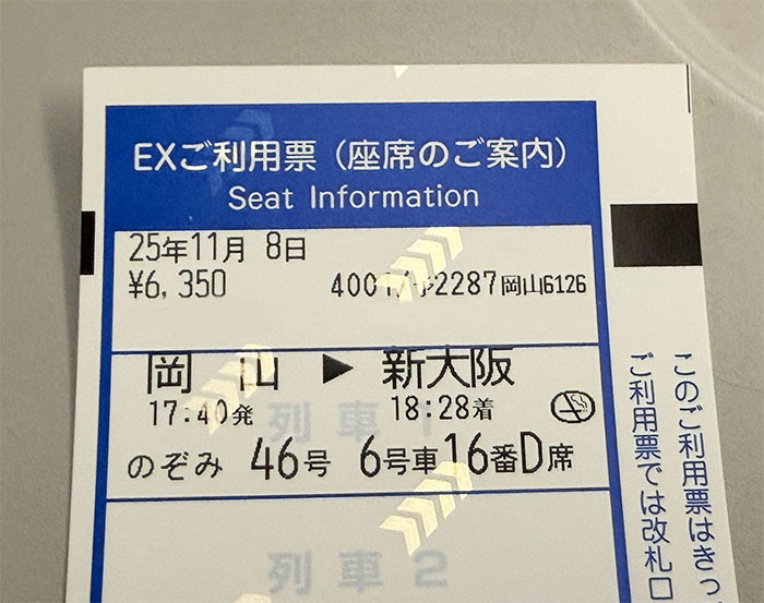岡山駅へ行く道中、EX予約で岡山17:40発、のぞみ46号を予約。