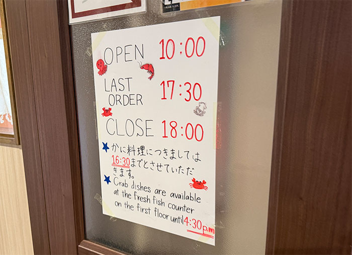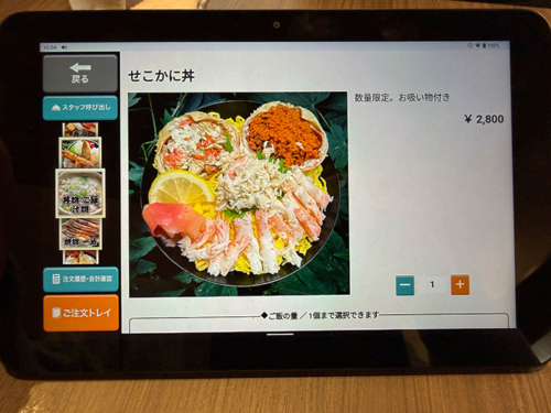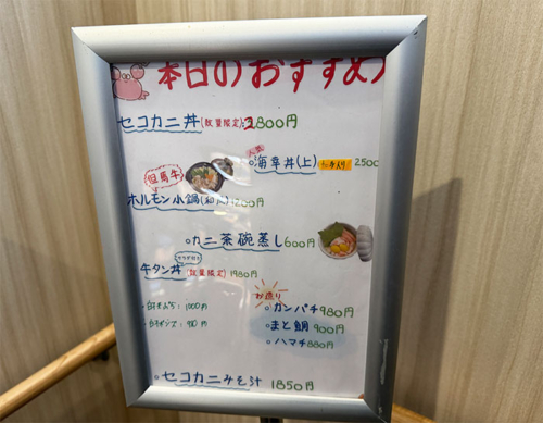 店の外の「本日のおすすめ」にセコカニ丼が書いてありましたが、元々税込3,800円だったのが豊漁で2,800円に下がったようで。