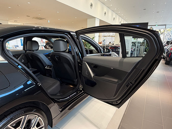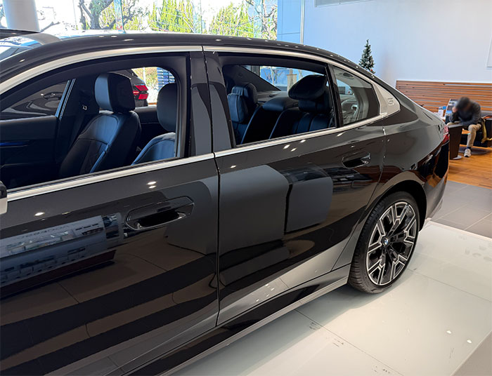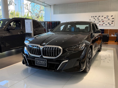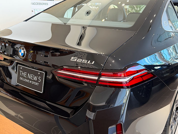 ショールームに、この前モビリティショーで見た5シリーズのロングホイールベース版、525Liが置いてあった。