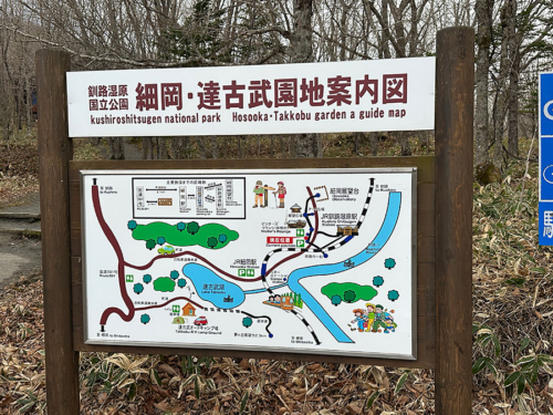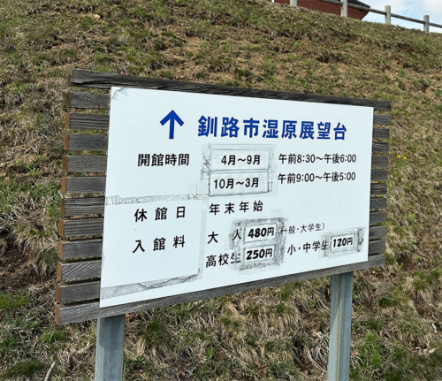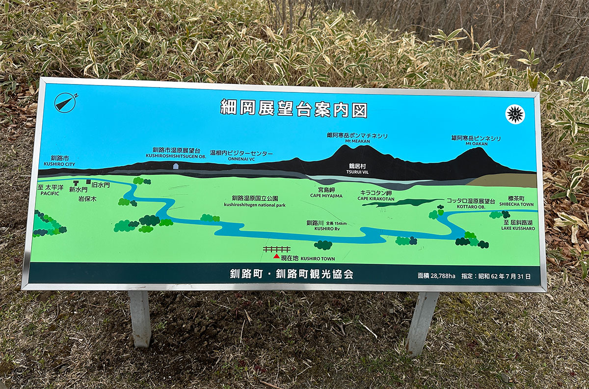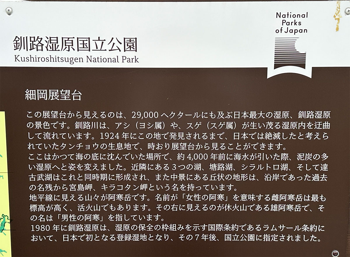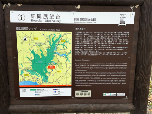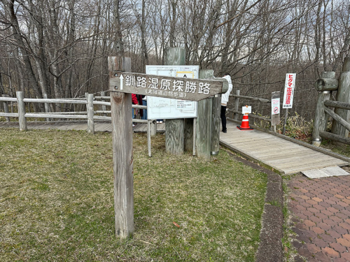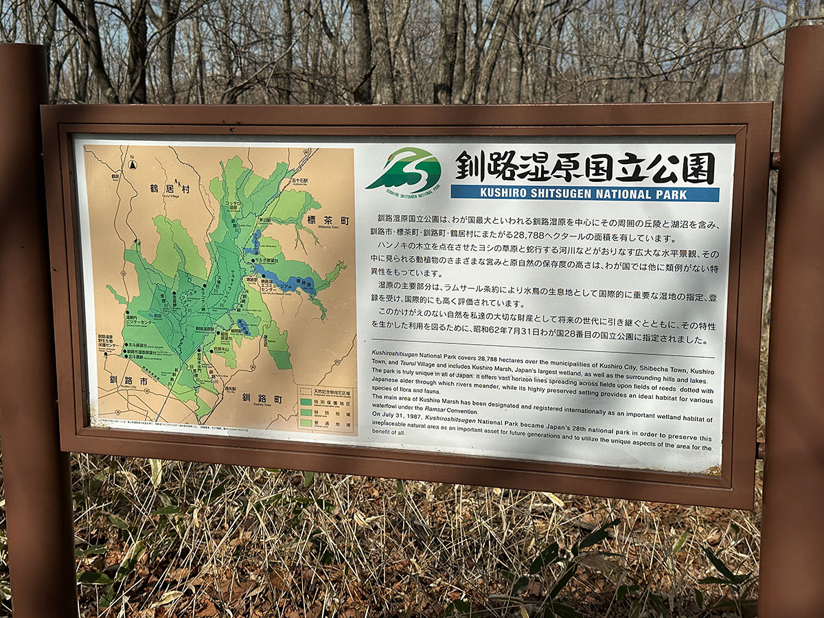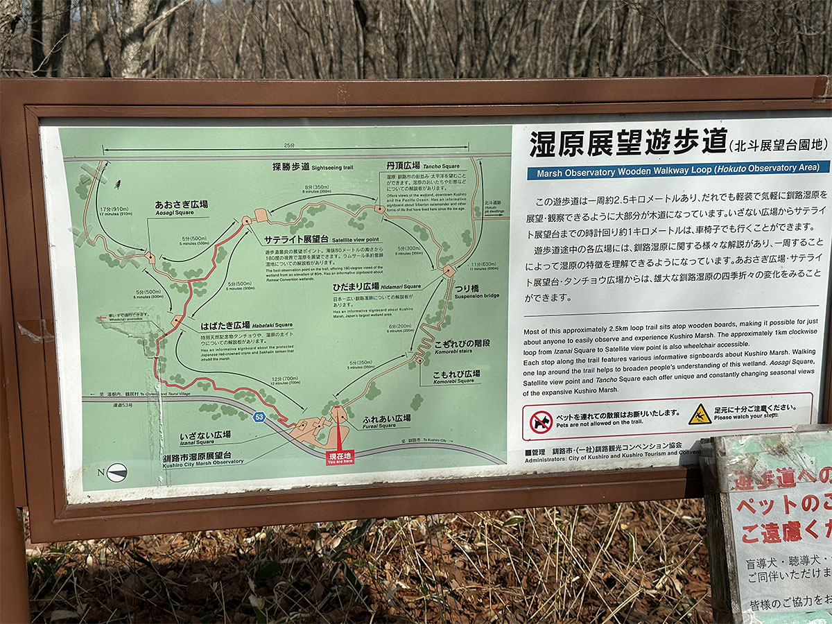 私は展望台の裏側にあたる場所から遊歩道を時計回りに進み約40分ほどで一周してきましたが、展望台の正面側から反時計回りに遊歩道へ入ると、釧路湿原国立公園の案内や・・・