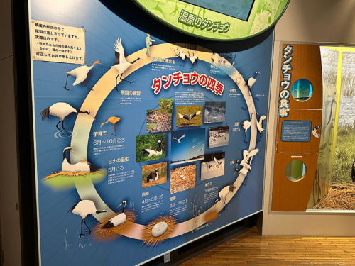 屋上展望台から階段を下ると、館内では釧路湿原で見られる動植物やタンチョウに関する展示が。