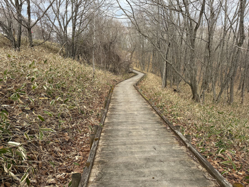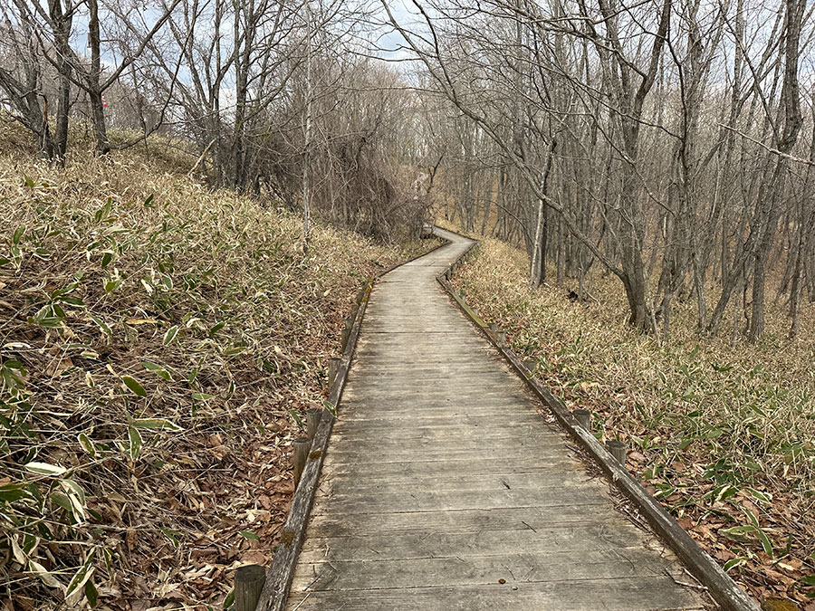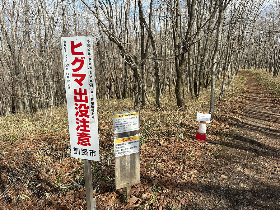 遊歩道の坂を上り切ると、そこには「ヒグマ出没注意」の看板が。こわー。