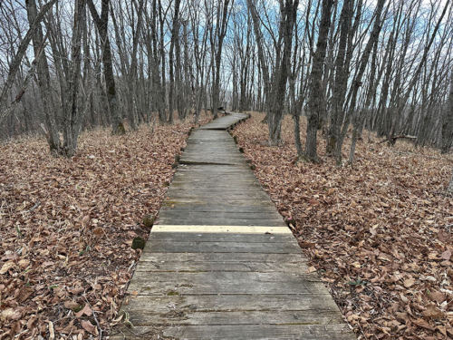 森の中に木の板で作られた遊歩道は、ところどころ板が割れていたり浮いていたりして修理された箇所もちらほらありますが、勾配は緩やかで車いすでも通れるように整備されてます。
