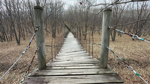 渡る前からねじれてたり、板が朽ちてなくなっているところもあったりして、低いのにスリリングな橋。