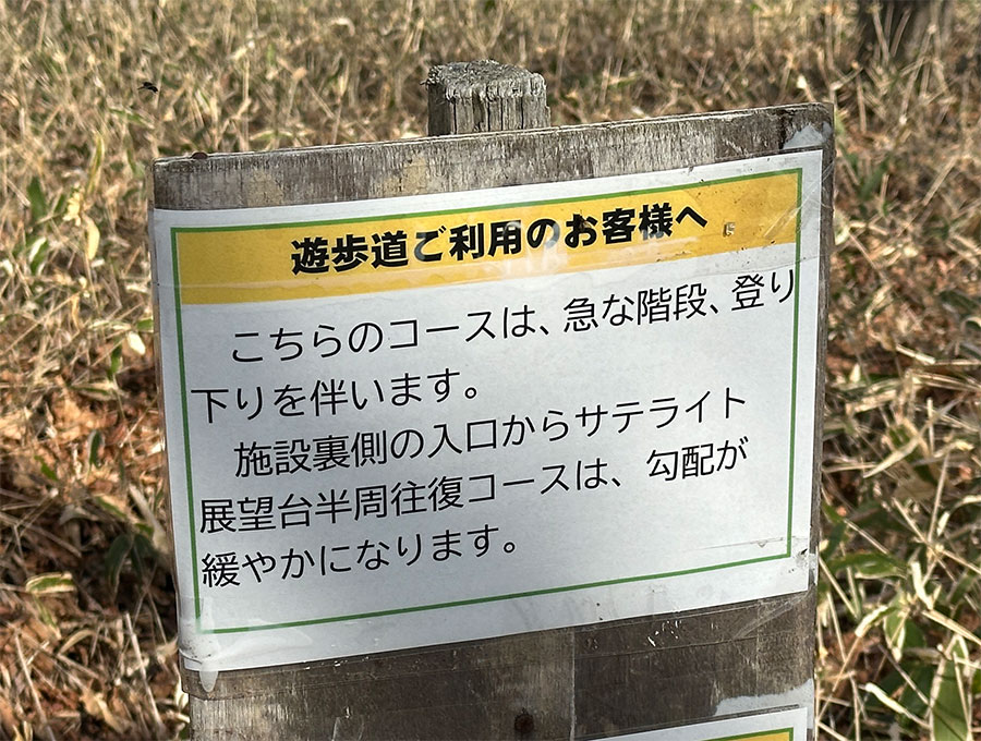 ただ、正面側から反時計回りに遊歩道を進むルートは、急な階段や登り下りを伴うと注意書きが!