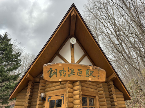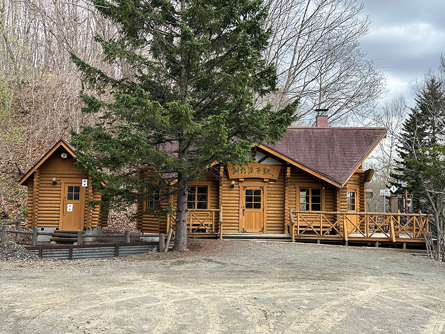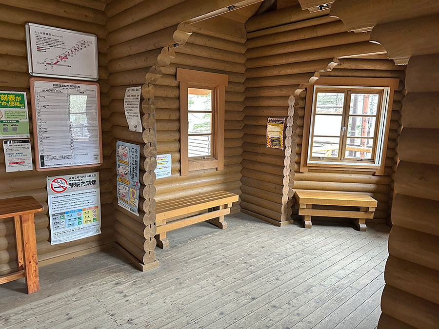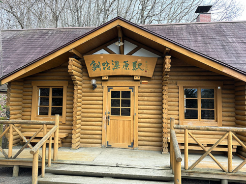 テラスのあるログハウスの釧路湿原駅の駅舎へ。
