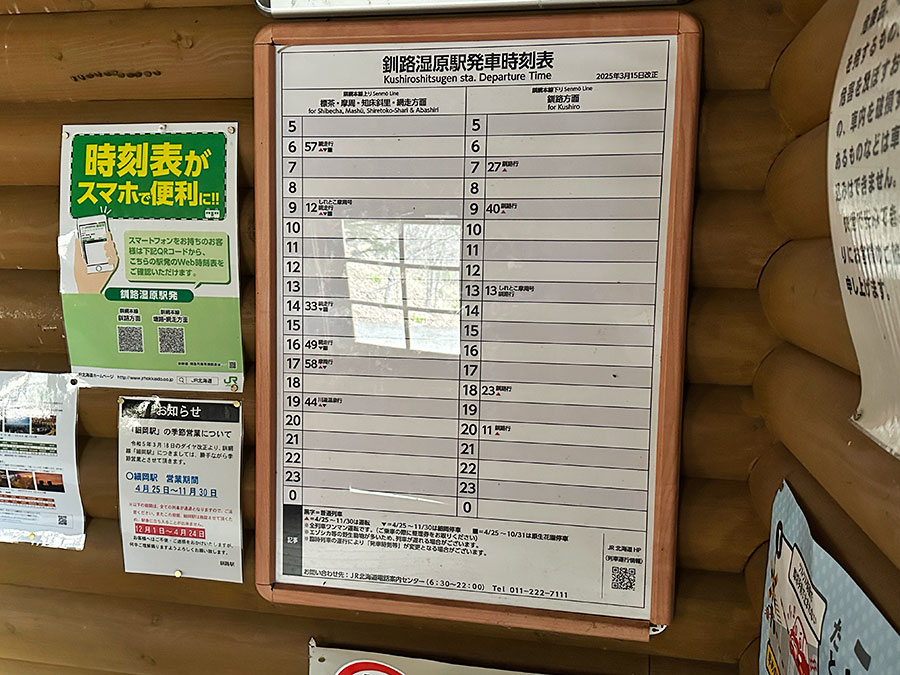 時刻表を見ると、上り網走行きは4本、途中の摩周行きと川湯温泉行きが1本ずつ、下り釧路行きは5本。