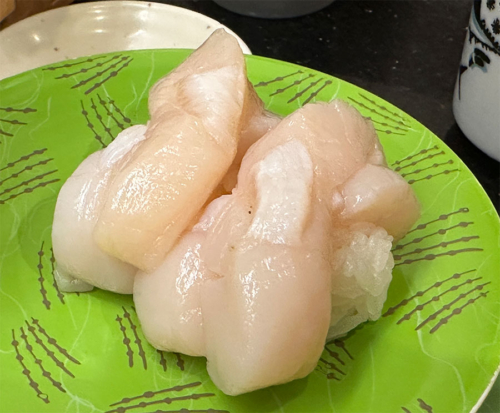 ぶりんぶりんな分厚いほたては濃厚な甘みがすんごーくおいしいのですが、これ、よく見ると・・・