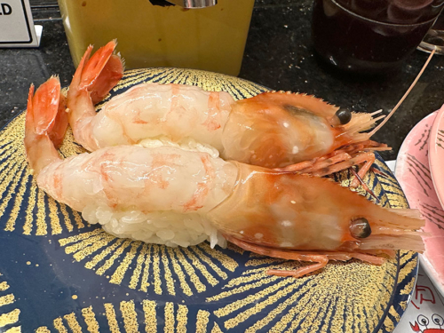 皿からはみ出そうなくらいのぼたんえび。一貫462円也。
