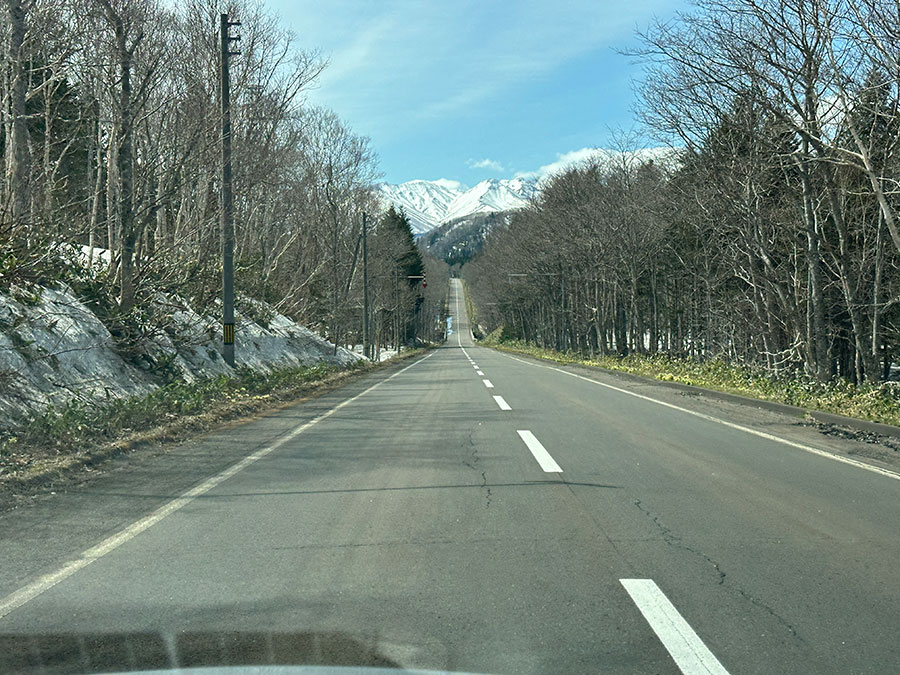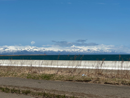 国道244号線に戻り海に沿ってを北上していると、冠雪した知床の羅臼岳が見えてくる。