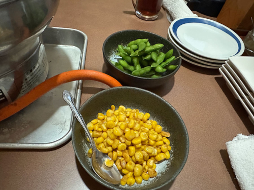 変わった形の半個室に案内され、早速オーダーしたのは中札内産枝豆とコーンバター。