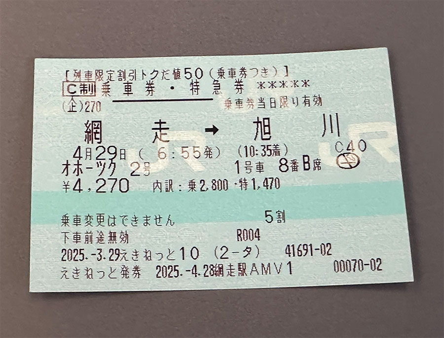 通常、乗車券5,610円と指定席特急券2,950円で8,560円のところ、えきねっとの「列車限定割引トクだ値50(乗車券つき)」で4,270円と割引率5割なのに半額以下に。