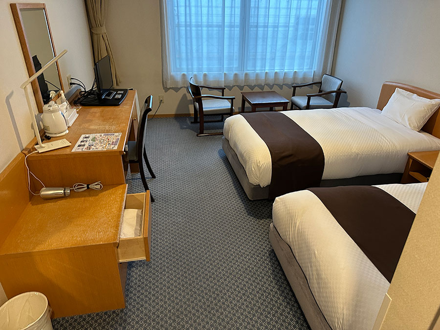 稚内での宿泊は『ホテル美幸』@北海道・稚内2025年12月14日(日)22:01 ホテル@北海道北海道_202504今回、稚内での宿泊は『ホテル美幸』へ。 なんだか場末のスナックのような名前ですが、スナック感はありません。 ツインの部屋に入ると・・・ 一般的なツインルームですが、やや広めの部屋。 ベッドサイドにはUSBが2口と100Vコンセント。 ホテルでレンタカーも借りられるので、観光拠点にいいかも。 2025年12月14日(日)22:01 ホテル@北海道北海道_202504Posted by Hepporon