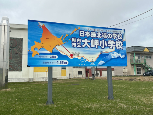 かつ、日本最北端の学校で、小学校の前には大きな看板も。
