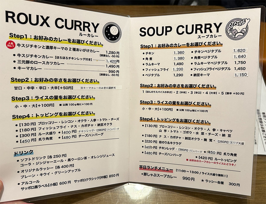 ここではスパイスカレーを「ルーカレー」と呼ぶらしく、メニューを見るとルーカレーとスープカレーに分かれてました。