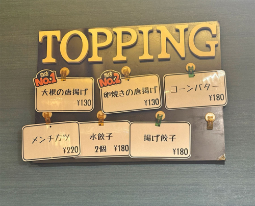 店内の壁にトッピングメニューが掛けてあり、他店では見たことのない「大根の唐揚げ」や「卵焼きの唐揚げ」が人気ワンツーなようで、これは試してみたくなってくる。