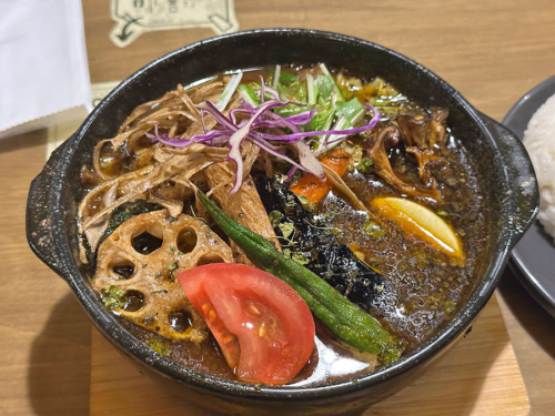 スープカレーはレッグチキン、人参、ナス、ブロッコリー、ごぼう、山芋、水菜、れんこん、キャベツ、紫キャベツ、トマト、オクラ、カボチャ、キクラゲ、舞茸、ゆで卵が入りボリューム満点。