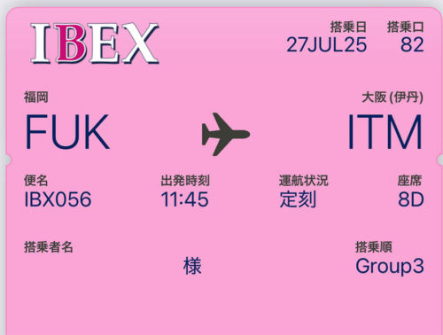 IBEXはANA仕様のモバイル搭乗券ですが、色がピンク過ぎて搭乗券っぽくなかったりして。